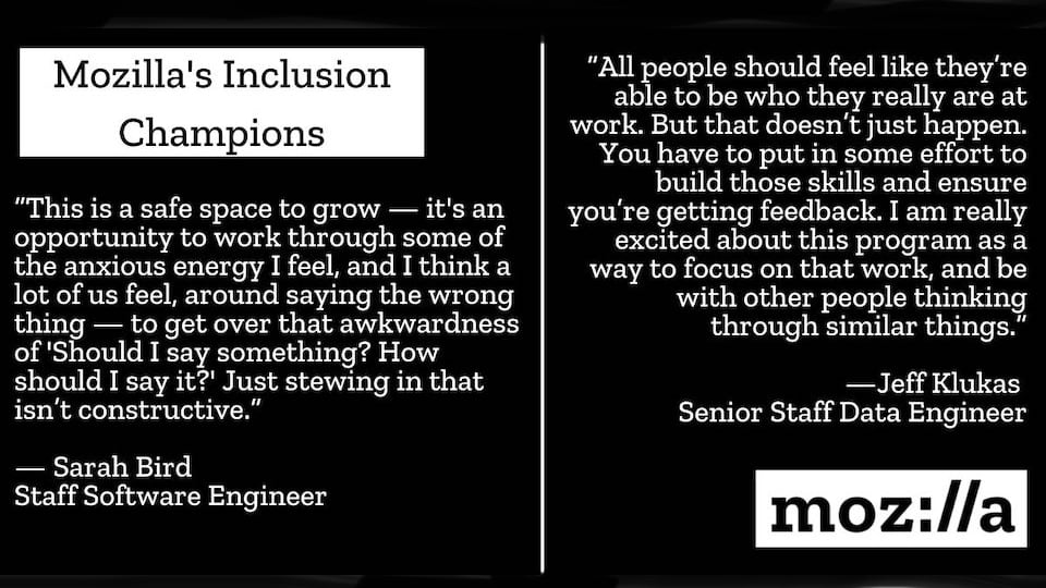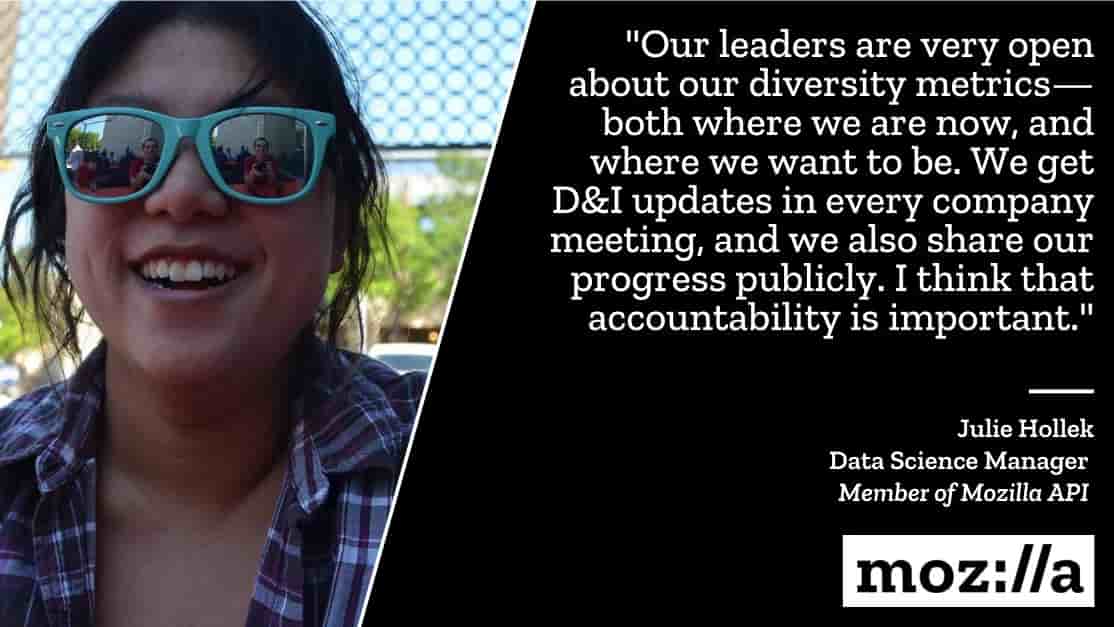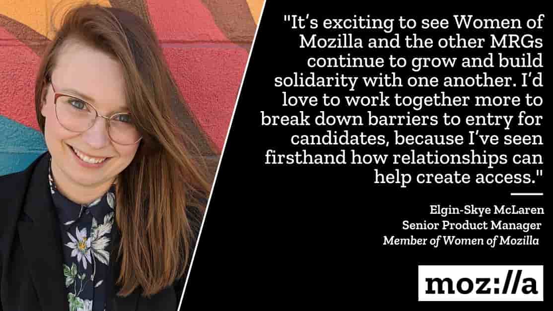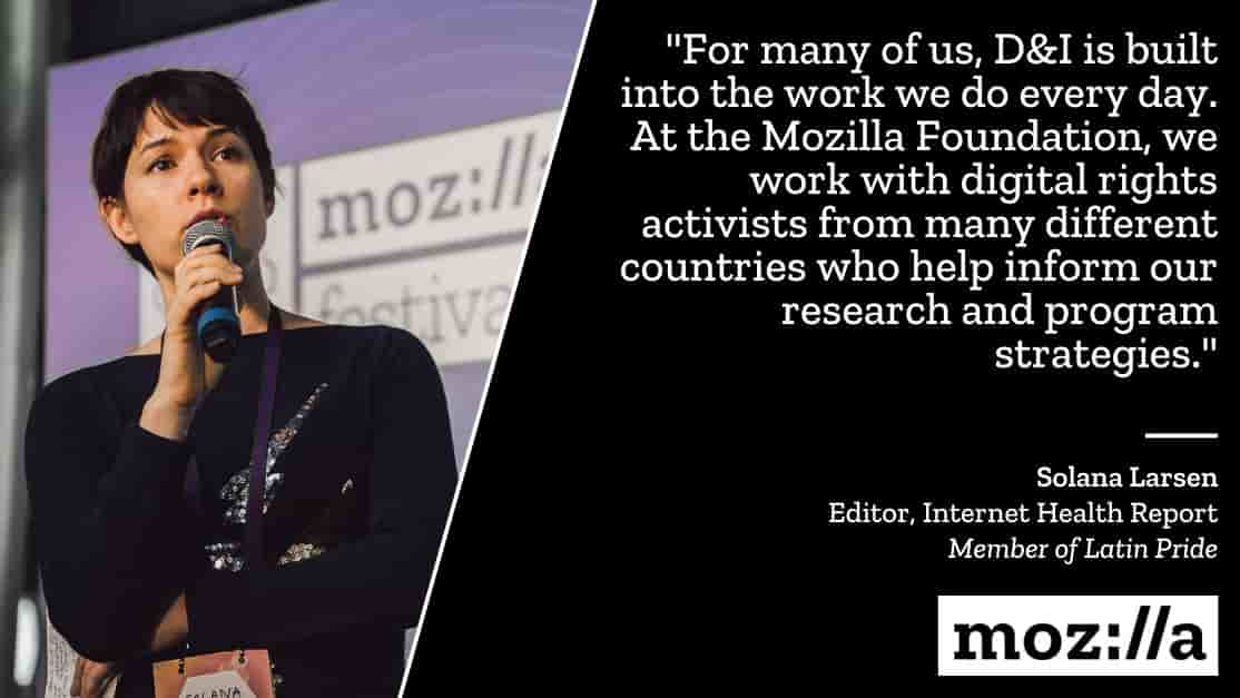 Mozilla resource groups (MRGs) are internal networks where people can find connection and community across different experiences and backgrounds. These groups have formed organically over the years through employee interest, and nearly one-third of all Mozilla employees belong to at least one MRG. We believe our growing list of MRGs — Afrozillians, Disability@Mozilla, LatinPride, MozAPI, Pridezilla, and WoMoz — are critical to our success as an organization and our journey toward inclusion. In 2021, our MRGs sought to define themselves and determine how to show up in a way that was authentic to their experiences. MRG members also had access to learning and development opportunities, including group leadership coaching, and introductory chats to build their networks. It was also a year of firsts for our MRGs, with the founding of MozAPI, Disability@Mozilla, and Pridezilla_allies.