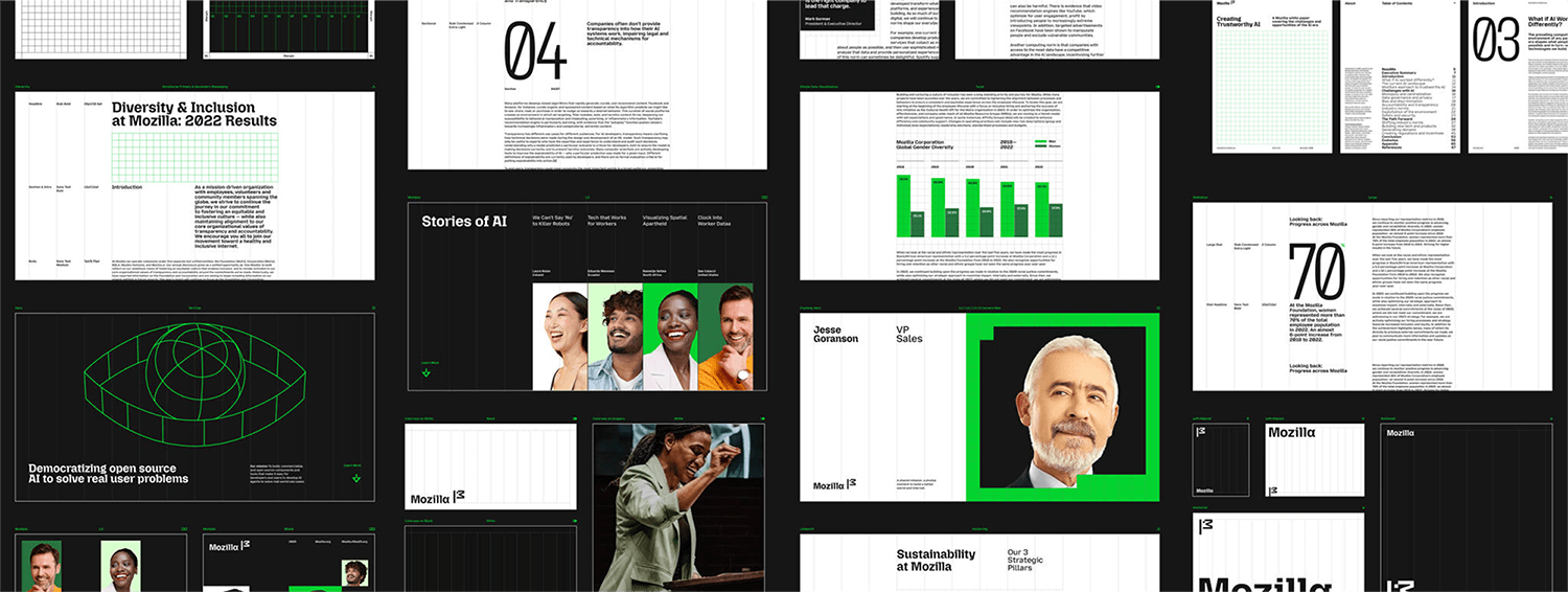 The visual elements of the new brand were carefully chosen to emphasize Mozilla's mission. The color palette begins with black and white as a strong foundation, complemented by a fresh green hue that represents growth, renewal, and our mission to make the internet better for everyone. Our new bespoke typeface inspired by the Zilla typeface, is more contemporary, with its own custom characters. It informs our wordmark, complements our symbol and is completely true to us! Oh and it’s open source of course. We are not precious. We want our toolkit to be available to everyone so it can be leveraged in different places.